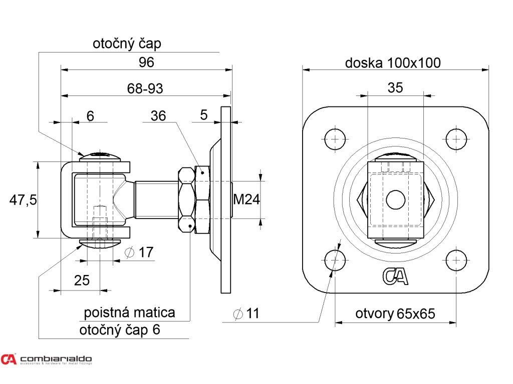 COMBI ARIALDO záves M24 s platňou 100 x 100 mm, otvárateľný 90°, nastaviteľný 1D, čiastočne pozinkovaný