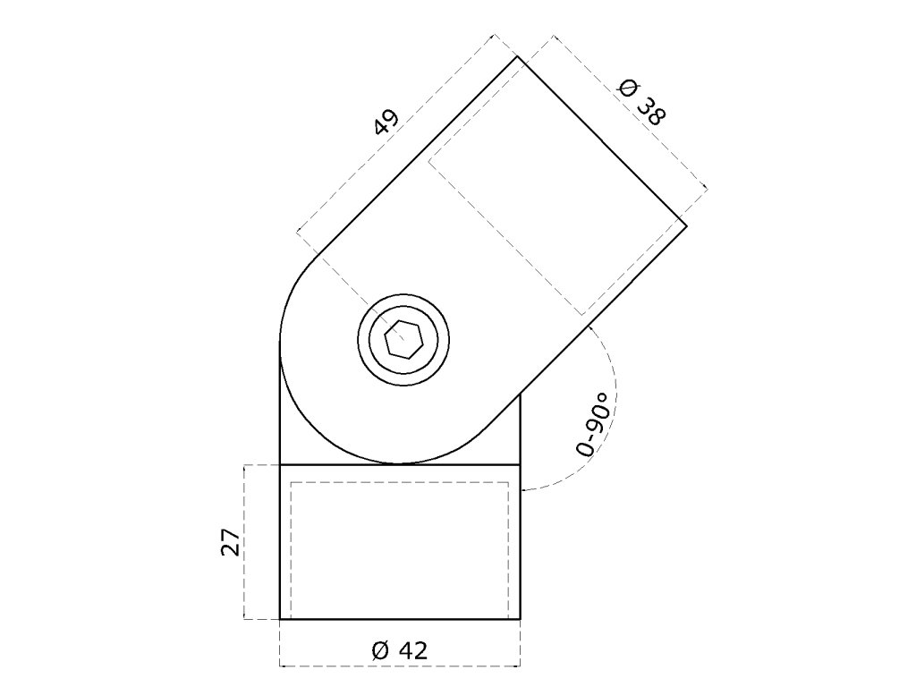 spojovací oblúk s kĺbom s medzikusmi (ø 42mm), nastaviteľný, na drevené madlo, brúsená nerez K320/ AISI304