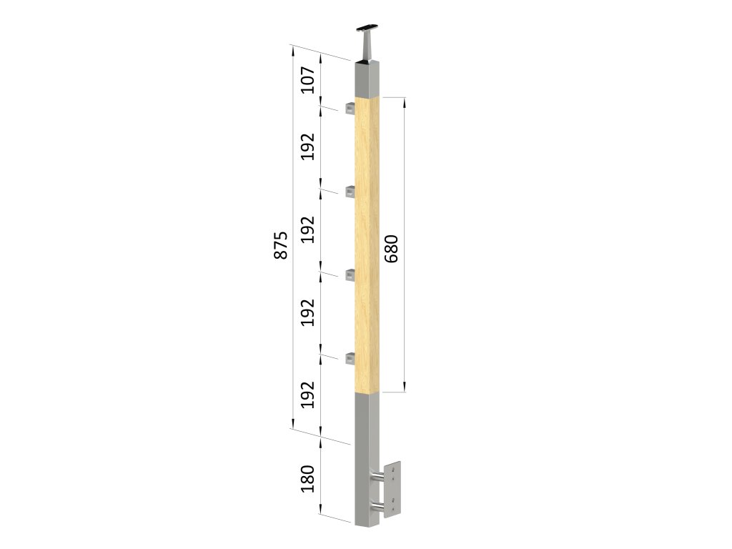 drevený stĺp, bočné kotvenie, 4 radový, priechodný, vonkajší, vrch pevný (40x40mm), materiál: buk, brúsený povrch s náterom BORI (bezfarebný)