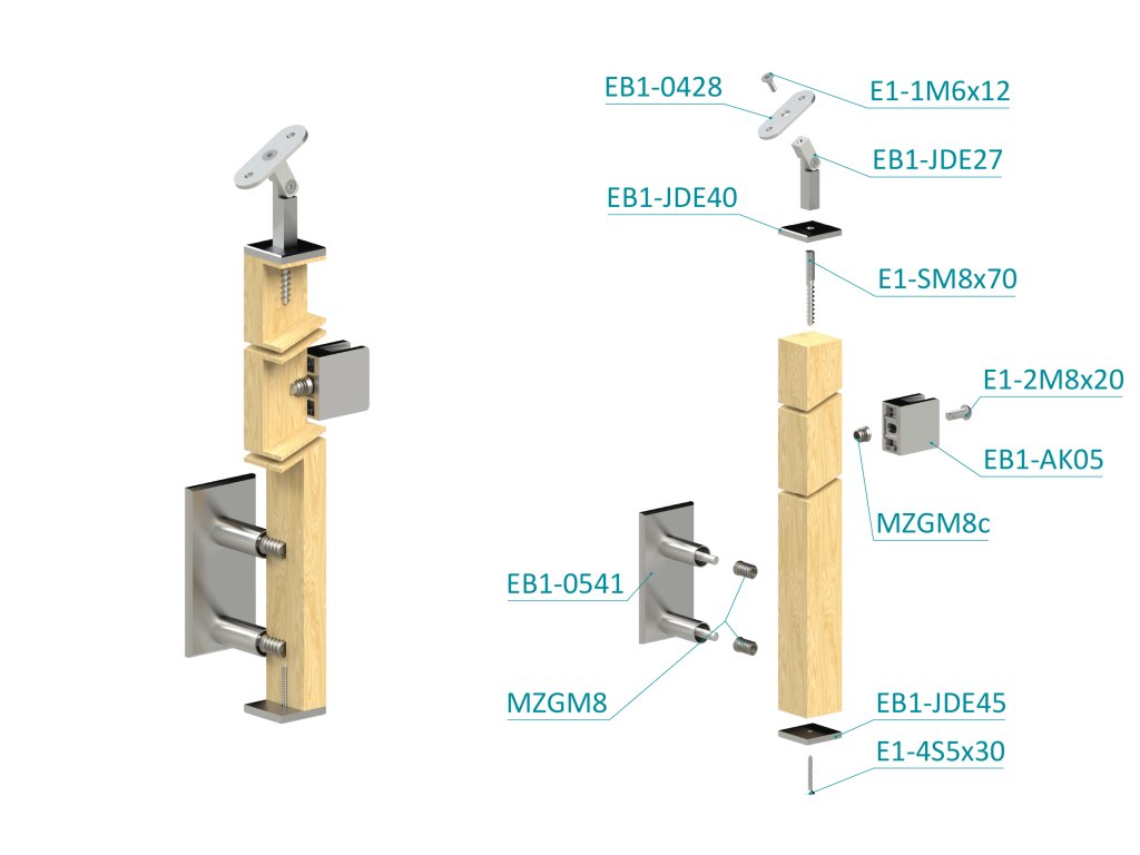 drevený stĺp, bočné kotvenie, výplň: sklo, koncový, pravý, vrch nastaviteľný (40x40mm), materiál: buk, brúsený povrch bez náteruDodatočné parametre