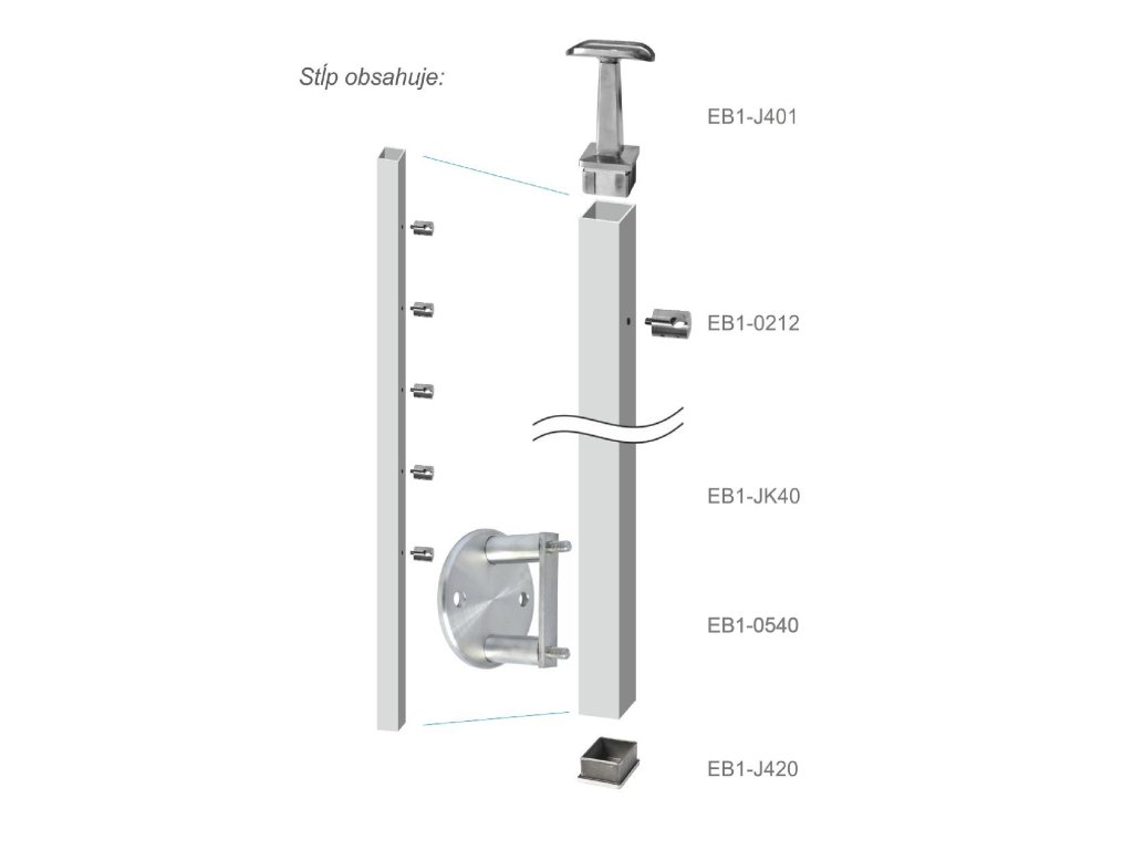 Nerezový stĺp, bočné kotvenie, 5 radový priechodný, vnútorný, vrch pevný(40x40mm), brúsená nerez K320 /AISI304