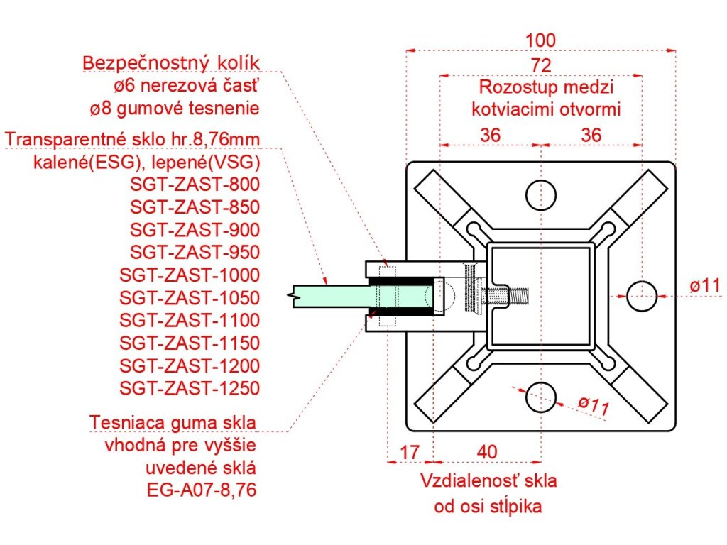 nerezový stĺp, vrchné kotvenie, výplň: sklo, ľavý, vrch pevný (40x40mm), brúsená nerez K320 /AISI304Dodatočné parametre