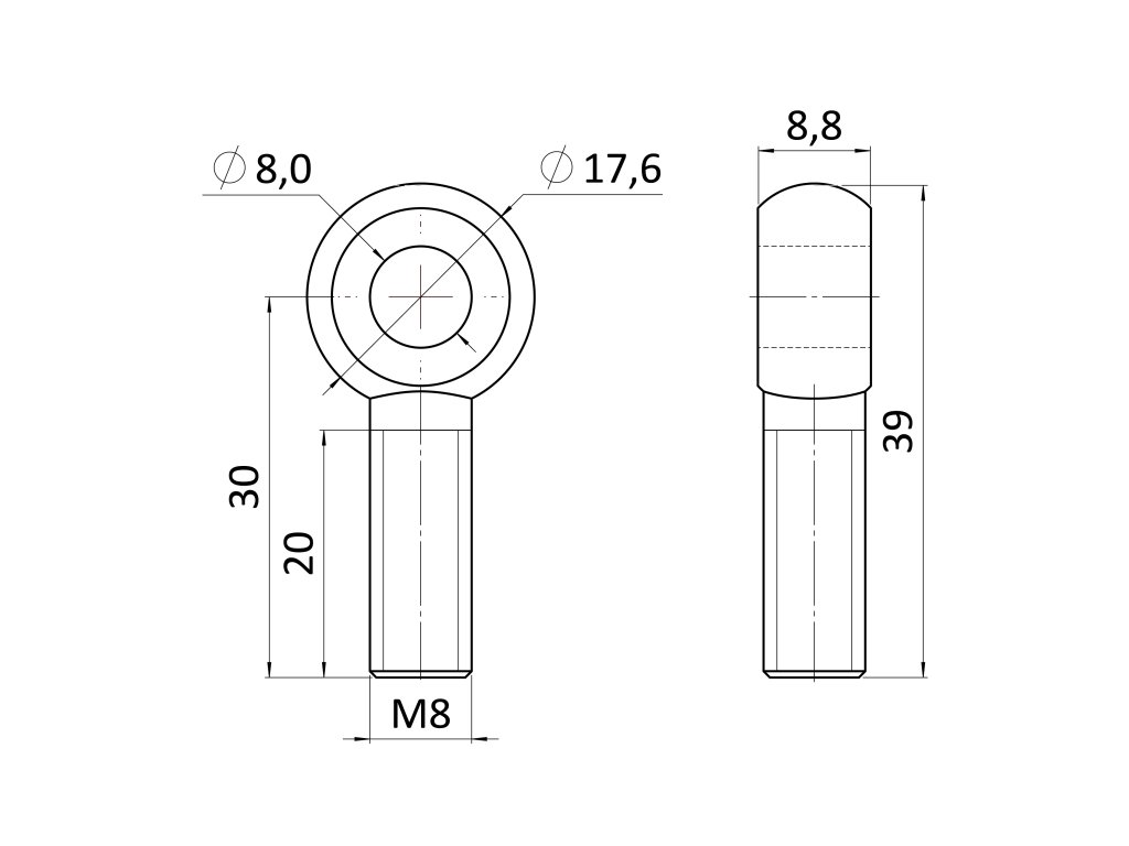 Nerezová skrutka s okom, metrický závit, DIN444, M8x30, celý závit, AISI304