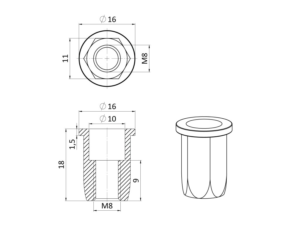 Nitovacia matica M8/0.5-3.5/ plochá hlava, hex, L=17mm, nerez