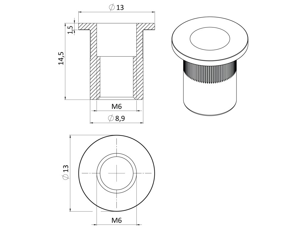 nerezová límcová nitovacia matica M6, zapustená hlava, ryhovaný driek, AISI304