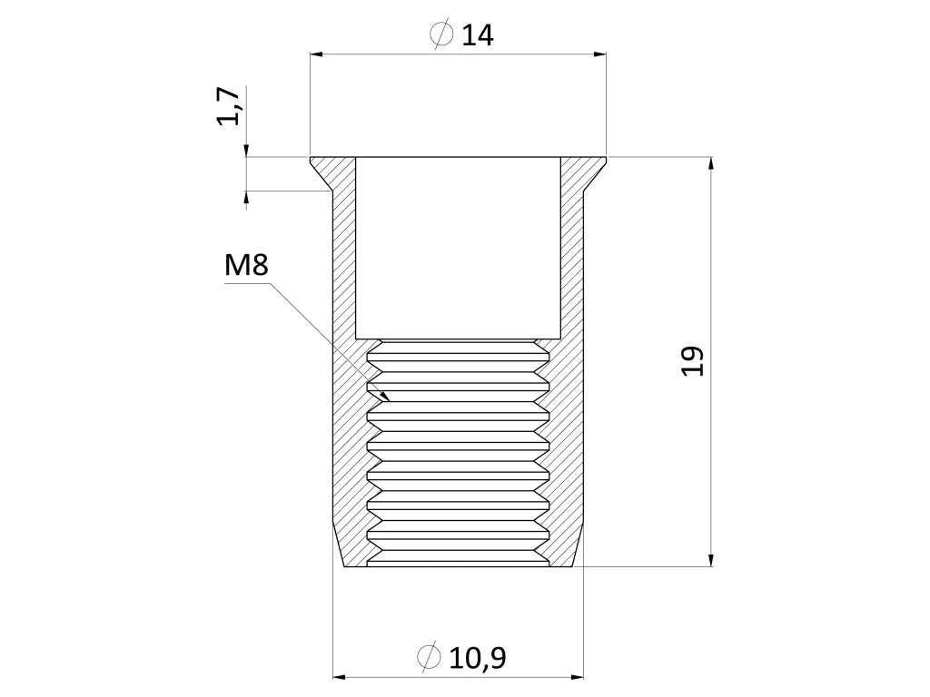 nerezová nitovacia matica M8, zapustená hlava, ryhovaný driek, AISI304