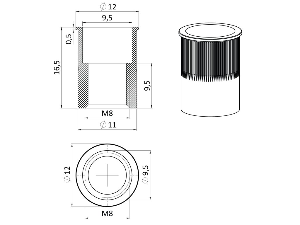 nerezová redukovaná nitovacia matica M8, zapustená hlava, ryhovaný driek, AISI304