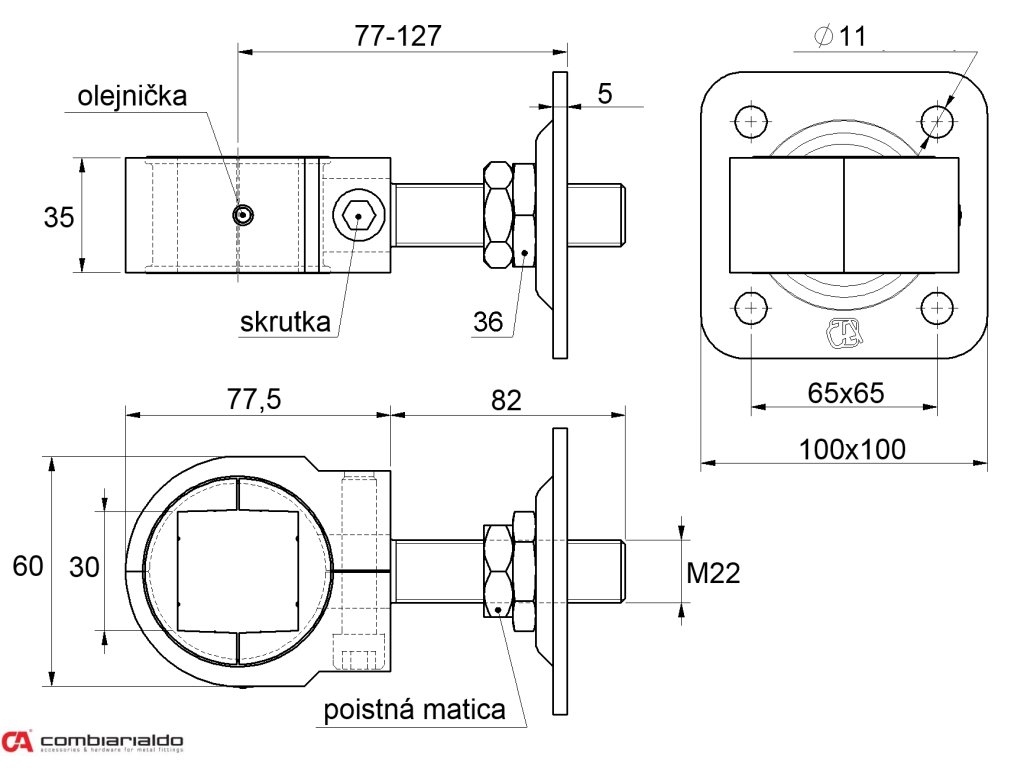 záves nastaviteľný M22 na upnutie štvorhranu 30x30mm, platňa 100x100mm