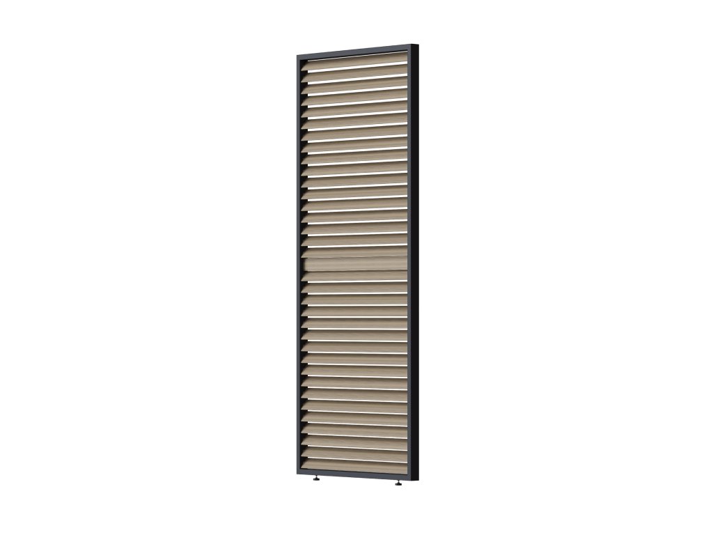 Tento panel predstavuje funkčný a estetický doplnok pre bočné zatienenie bioklimatickej pergoly. Je vybavený horizontálnymi lamelami s možnosťou manuálneho sklápania, čo umožňuje efektívnu reguláciu svetla, súkromia aj prúdenia vzduchu.Konštrukcia a materiál:
