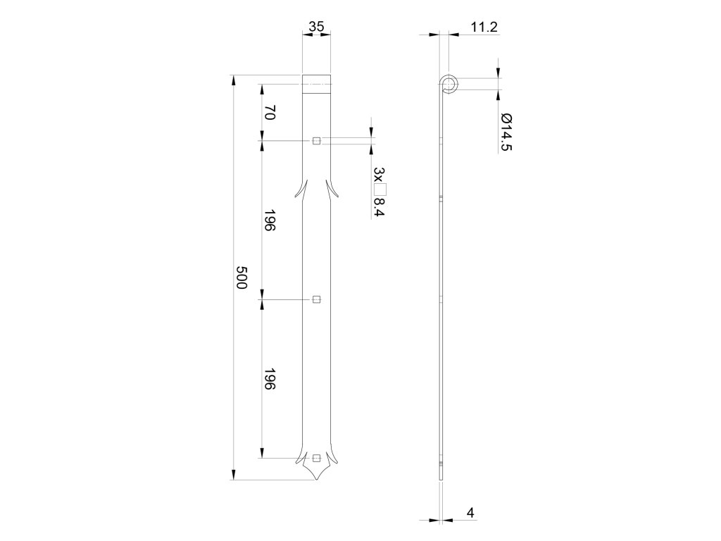 kovanie ozdobné - pásový záves 500x35x4 mm, otvor pre čap ø 14mm, povrch čierny lak