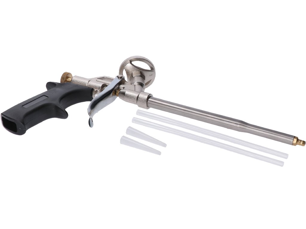 Pištoľový dávkovač peny je veľmi užitočným doplnkom pri práci s pištoľovou penou.Reguluje množstvo vytekajúcej peny, vďaka čomu je možné medzery vyplniť ekonomicky, bez plytvania materiálom.