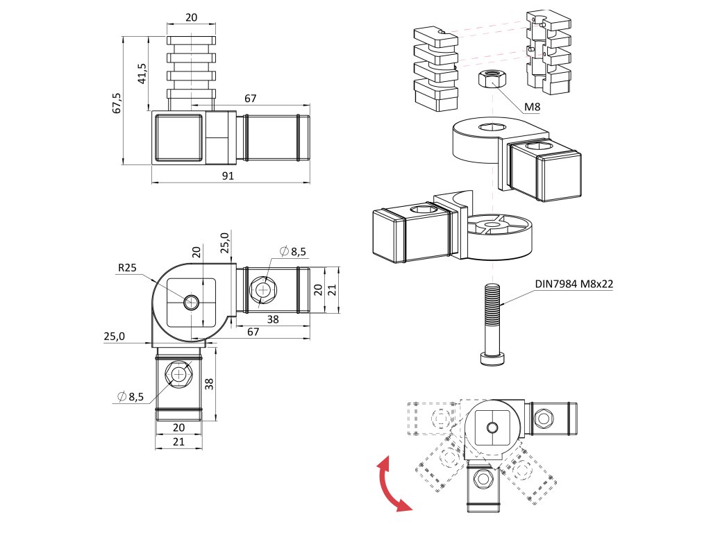 Plastová spojka - pohyblivý 180° rohový kus vhodný do profilu veľkosti 25x25x2