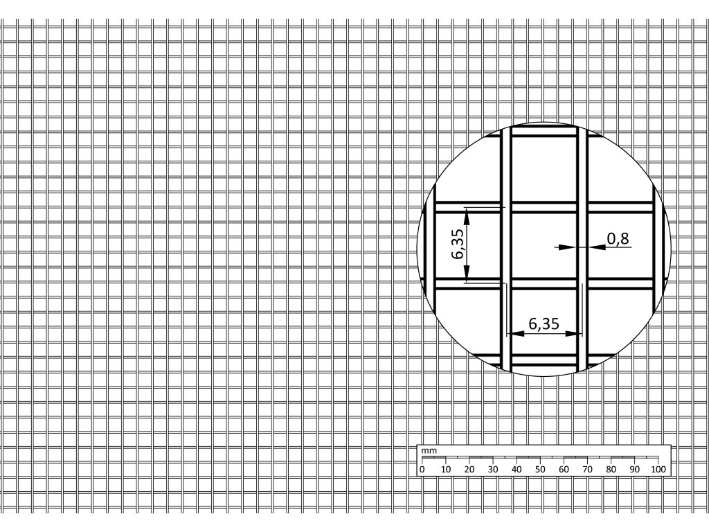 Nerezové zvárané sito - cena za 1m2; veľkosť oka: 6.35x6.35mm; Hrúbka drôtu: 0.8mm; Šírka: 1000mm; Materiál: AISI304, max dĺžka 30 metrov