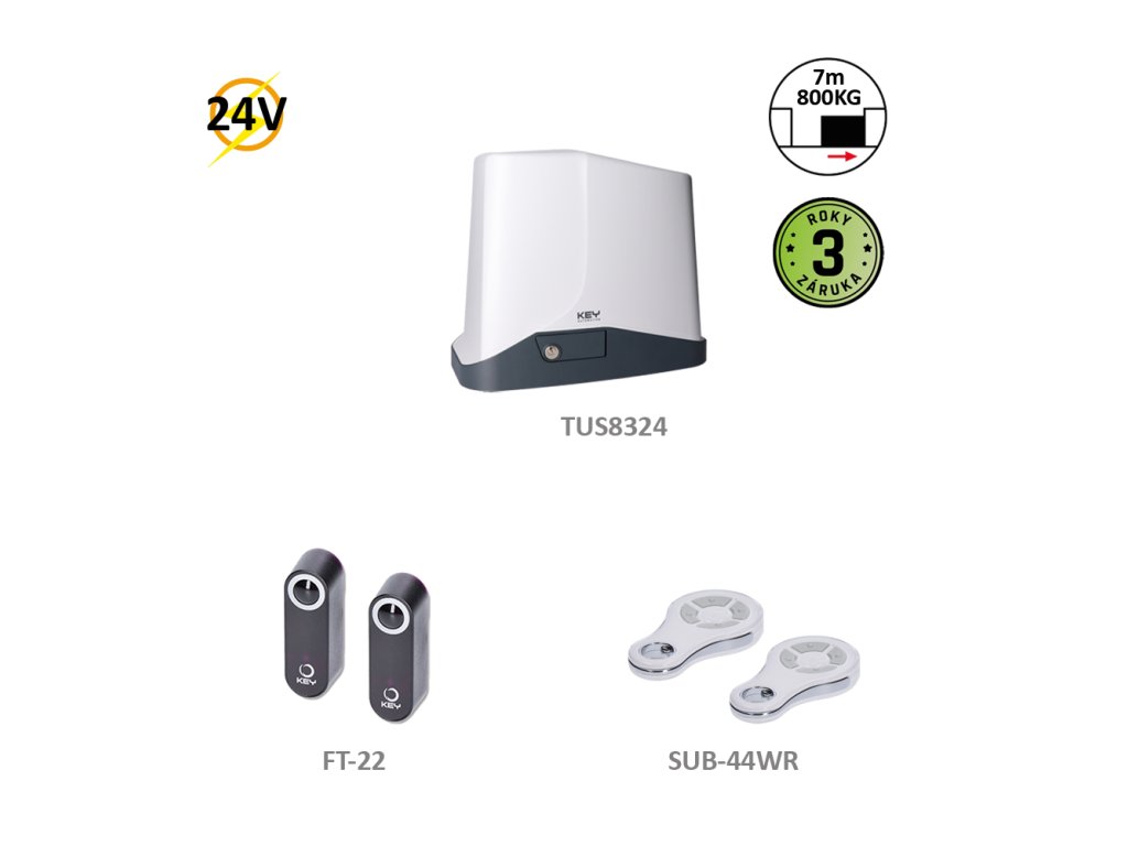 Kompletná sada od KEY Automation určená na automatizáciu posuvných brán do hmotnosti 800kg. Obsahuje výkonný motor a potrebné príslušenstvo:1× TUS8324 – motor 24V, 345W s vysokou účinnosťou a plynulým chodom