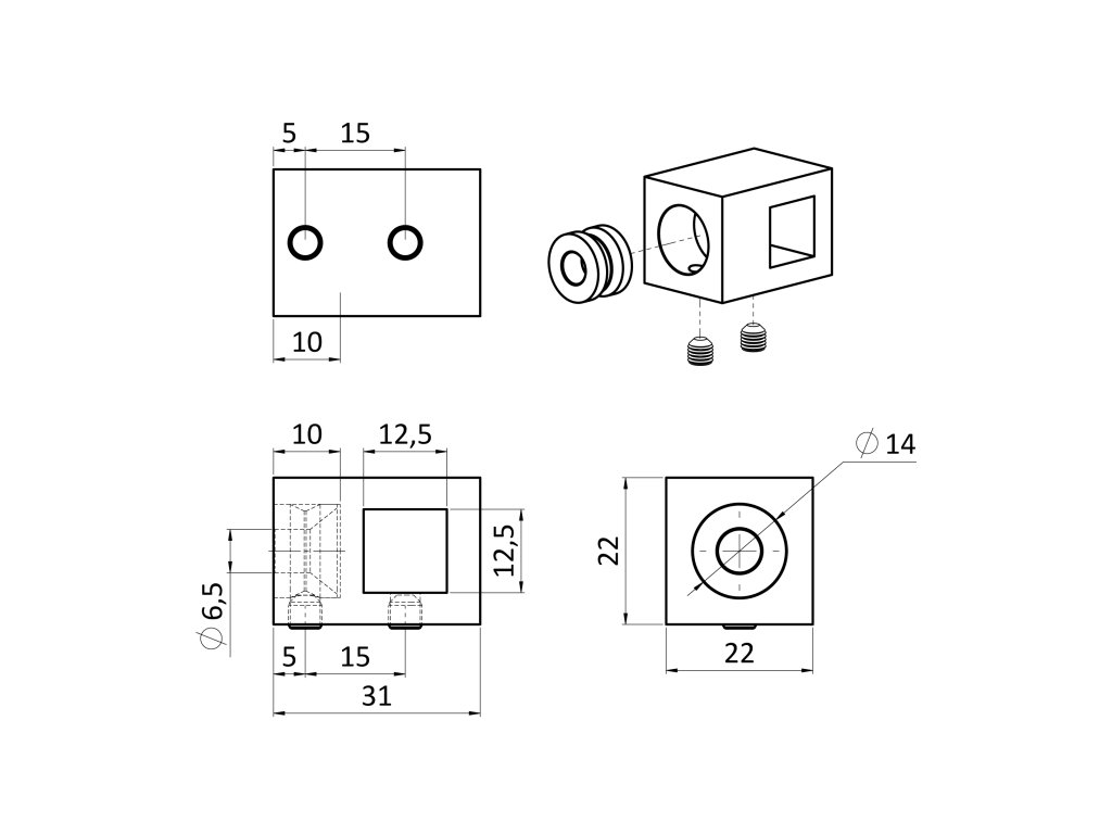 Držiak štvorhranného profilu 12x12mm (koncový-ľavý), plochý, (30x22mm), brúsená nerez K320 /AISI304