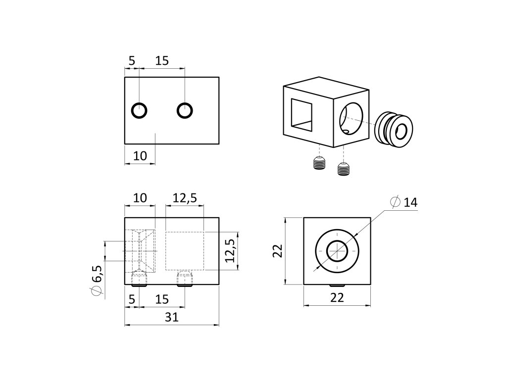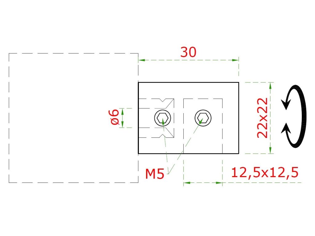 Držiak štvorhranného profilu 12x12mm (koncový-pravý), plochý, (30x22mm), brúsená nerez K320 /AISI304