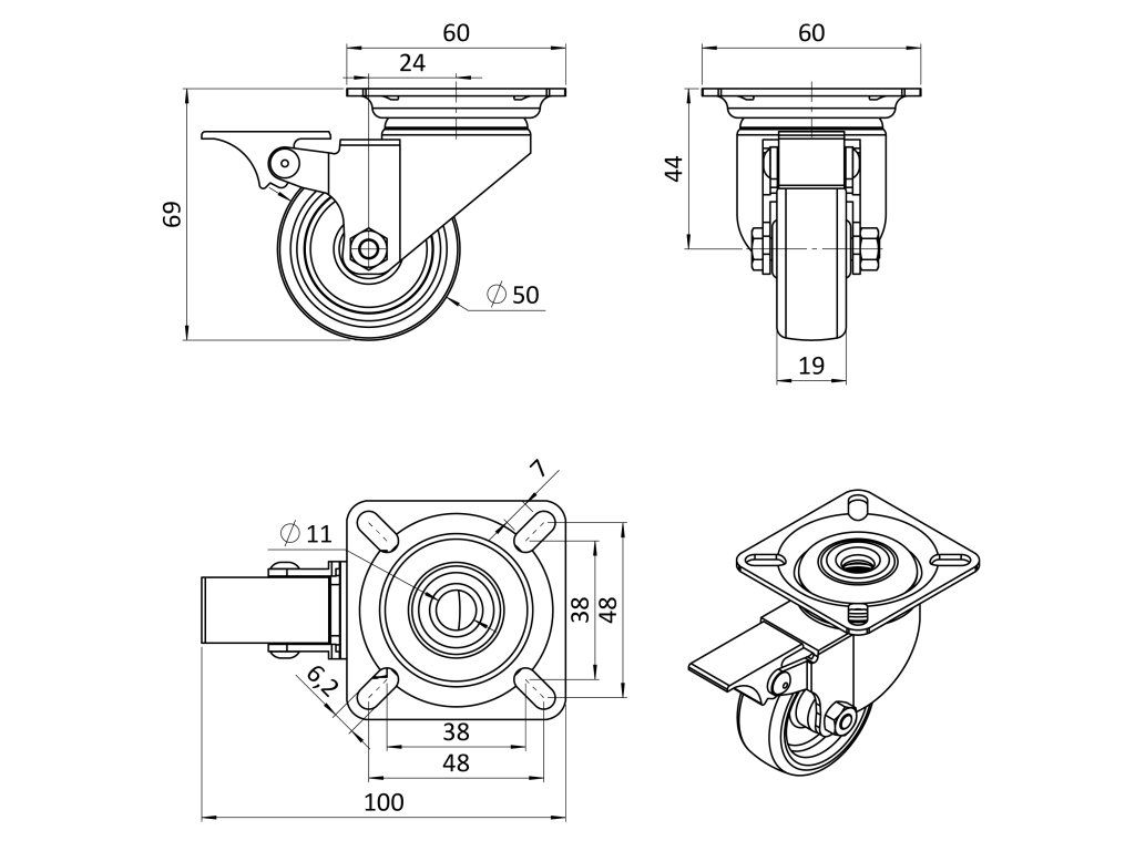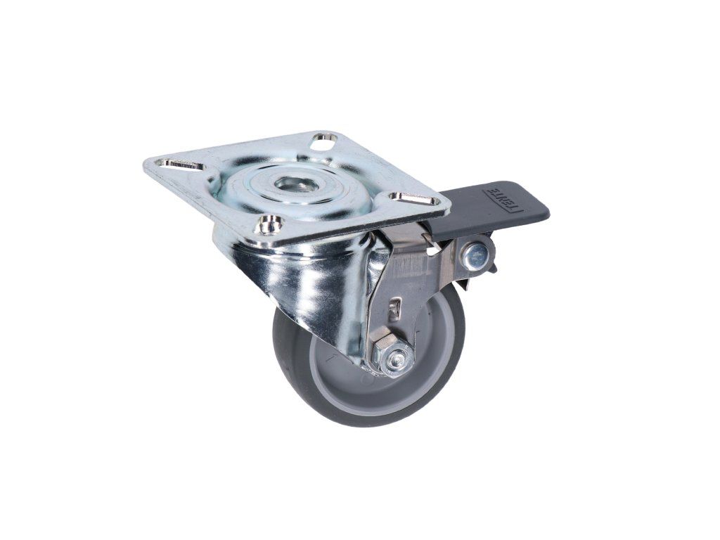 Otočné koliesko, vidlica vyrobená z oceľového výlisku - zinkovaná. Dvojitá guľôčková dráha v hlave otoče. Platnička so 4 otvormi na uchytenie kolieska. Stred kolieska vyrobený z polypropylénu, behúň kolieska z termoplatickej gumy - TENTEPRÉN. Klzné uloženie. Brzda kolesa.Dodatočné parametre