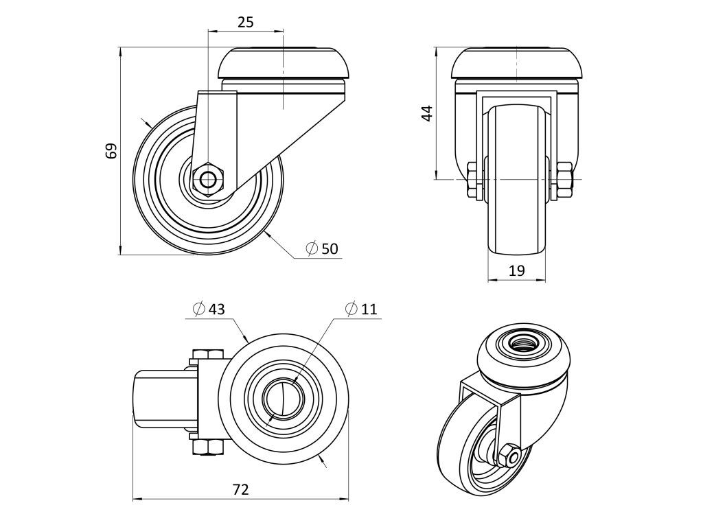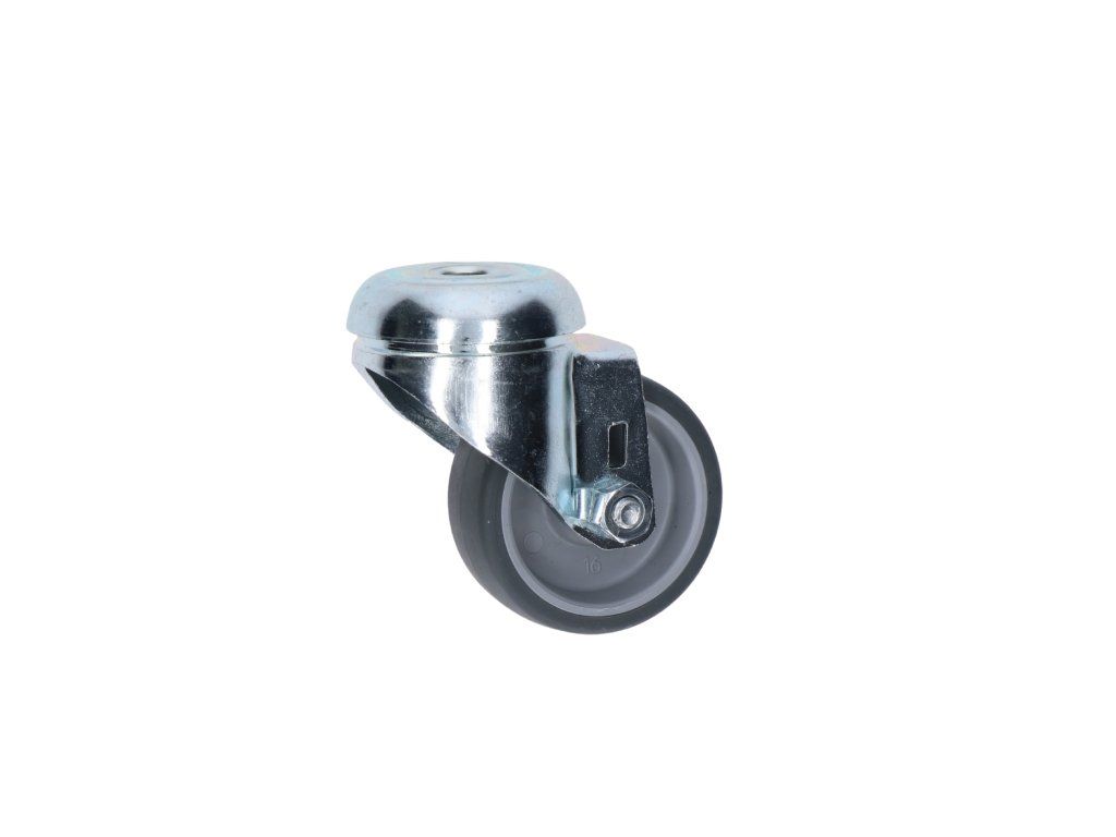 Otočné koliesko, vidlica vyrobená z oceľového výlisku - zinkovaná. Dvojitá guľôčková dráha v hlave otoče. Stredový otvor na čap priemeru 11mm. Stred kolieska vyrobený z polypropylénu, behúň kolieska z termoplatickej gumy - TENTEPRÉN. Klzné uloženie.Dodatočné parametre
