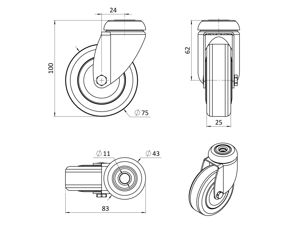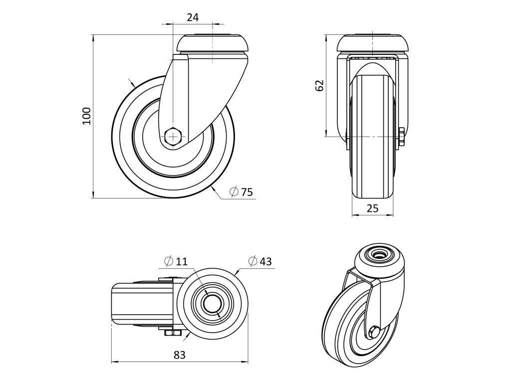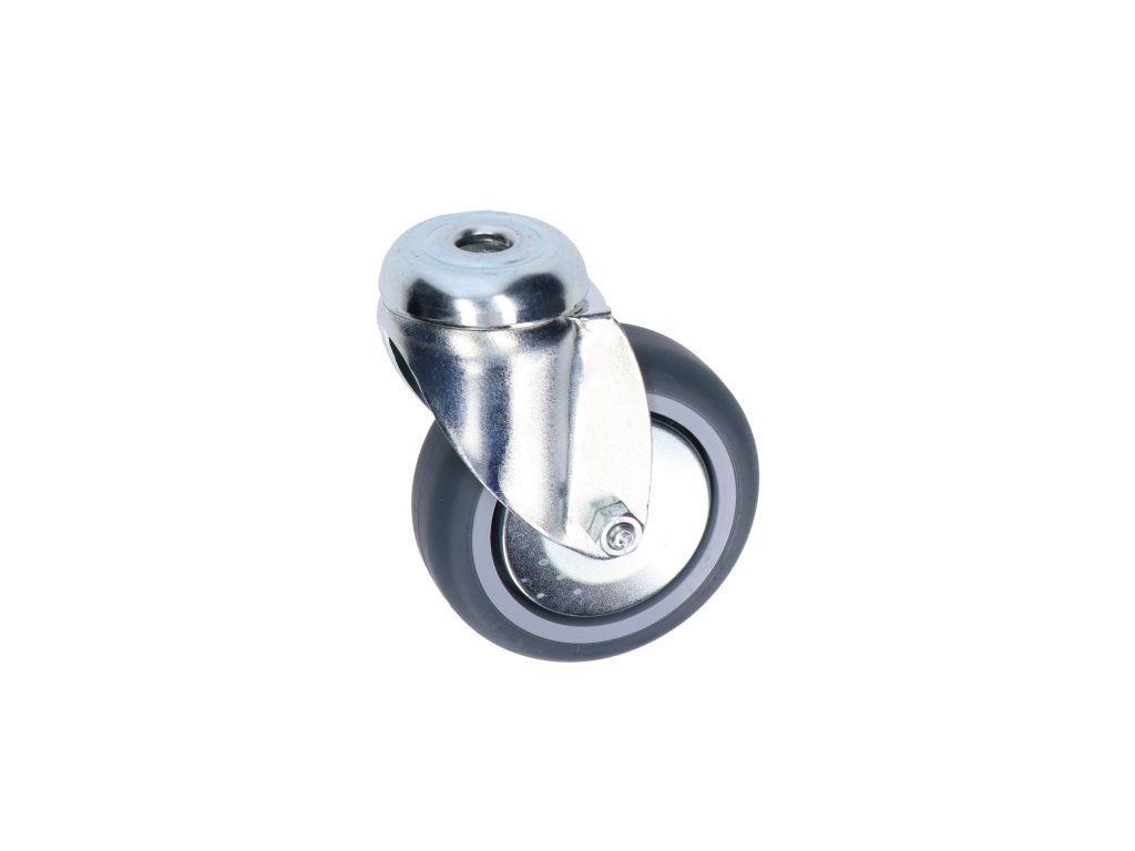 Otočné koliesko, vidlica vyrobená z oceľového výlisku - zinkovaná. Dvojitá guľôčková dráha v hlave otoče. Stredový otvor na čap priemeru 11mm. Stred kolieska vyrobený z polypropylénu, behúň kolieska z termoplatickej gumy - TENTEPRÉN. Klzné uloženie.Dodatočné parametre