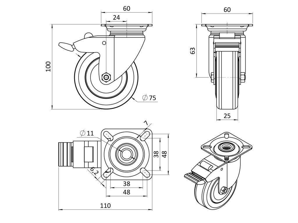 Otočné koliesko, vidlica vyrobená z oceľového výlisku - zinkovaná. Dvojitá guľôčková dráha v hlave otoče. Platnička so 4 otvormi na uchytenie kolieska. Stred kolieska vyrobený z polypropylénu, behúň kolieska z termoplatickej gumy - TENTEPRÉN. Klzné uloženie. Brzda kolesa.Dodatočné parametre