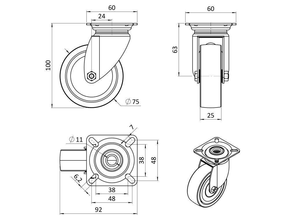 Otočné koliesko s platňou s behúňom zo syntetickej gumy, priemer 75mm