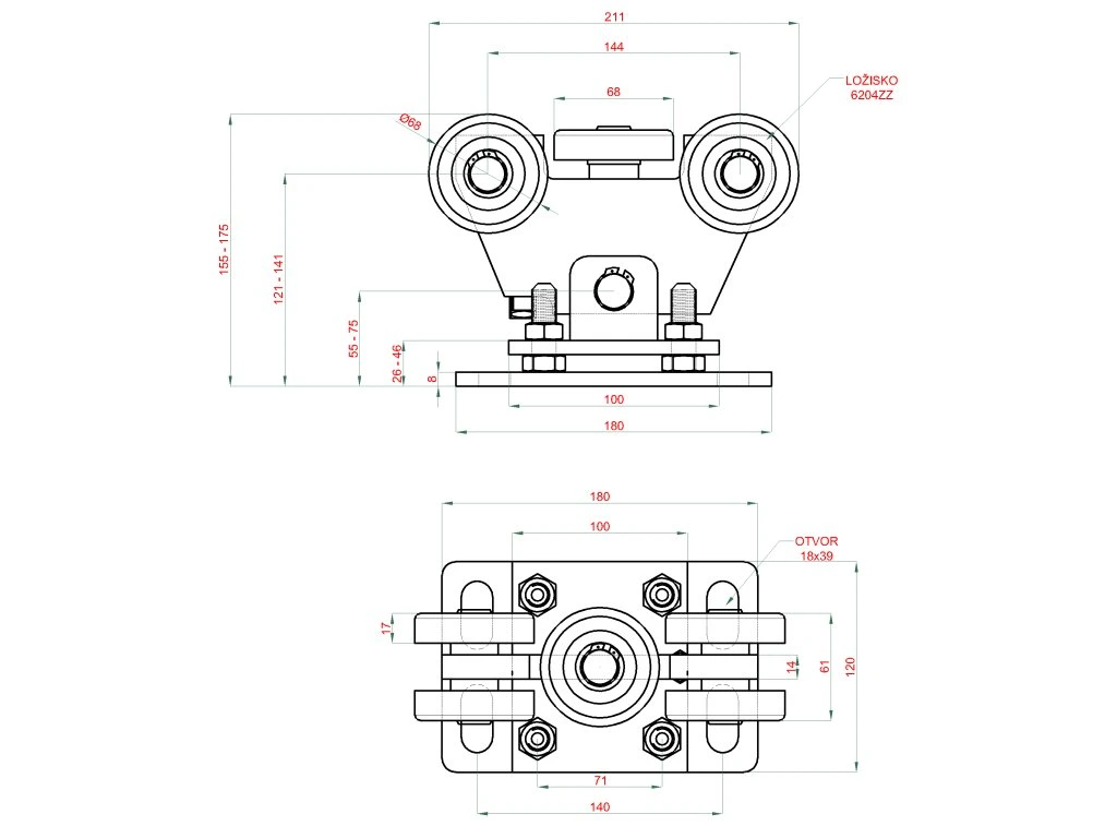 samonosný systém 80x80x5mm posuvnej brány do 300kg/5m otvor (W39/80Fe 6m čierný profil, 1x W-SET80/F)