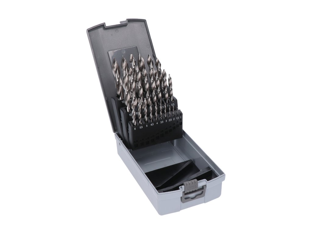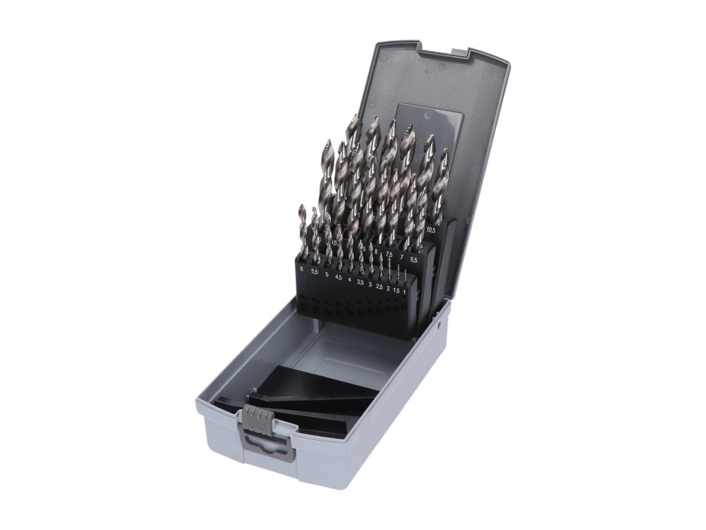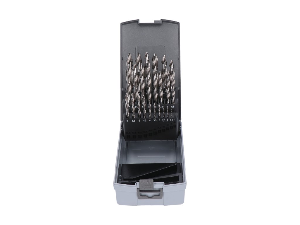 sada obsahuje: 1; 1,5; 2; 2,5; 3; 3,5; 4; 4,5; 5; 5,5; 6; 6,5; 7; 7,5; 8; 8,5; 9; 9,5; 10; 10,5; 11; 11,5; 12; 12,5 a 13Novinka v oblasti vŕtania, prevratné univerzálne vrtáky s obchodným označením RS.