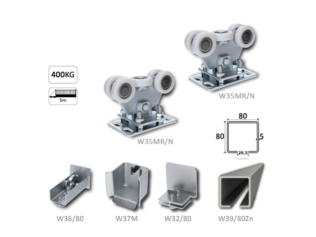 samonosný systém 80x80x5mm posuvnej brány do 300kg/5m otvor (W39/80Zn 6m pozinkovaný profil, 2x W35MR/N, 1x W36/80, 1x W37M, 1x W32/80)
