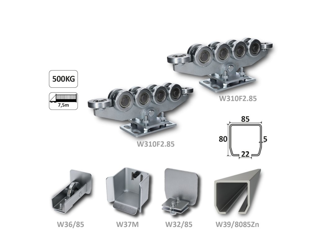 Samonosný systém 80x85x5mm posuvnej brány do 500kg/7.5m otvor (W39/8085Zn 6m pozinkovaný profil, 2x W310F2.85, 1x W36/85, 1x W37M, 1x W32/85)