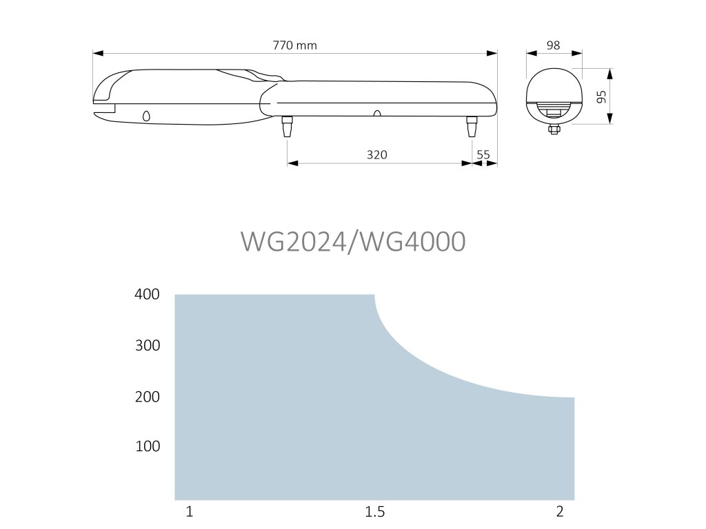 Pohon WINGO WG4000 od spoločnosti Nice je určený na automatizáciu krídlových brán s maximálnou dĺžkou krídla do 2 metrov. Ide o kompaktný elektromechanický pohon, ktorý sa vyznačuje spoľahlivým výkonom, jednoduchou inštaláciou a dlhou životnosťou.