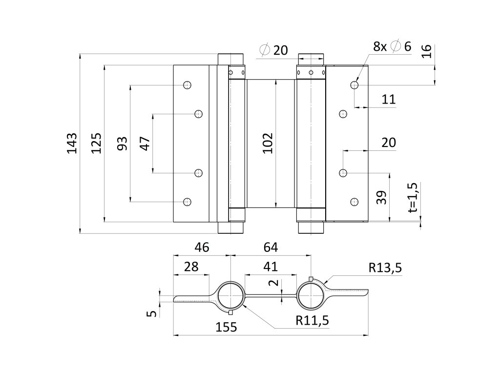 DVOJČINNÝ pánt pre krídlové dvere - samozatvárací, H - 125mm, nerezový, cena za PÁR