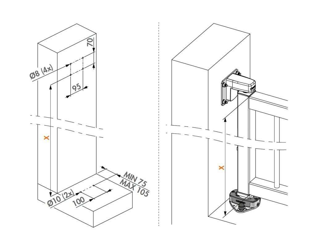 Vzdialenosť medzi bránou a stenou: min. 29 mm - max. 54 mm