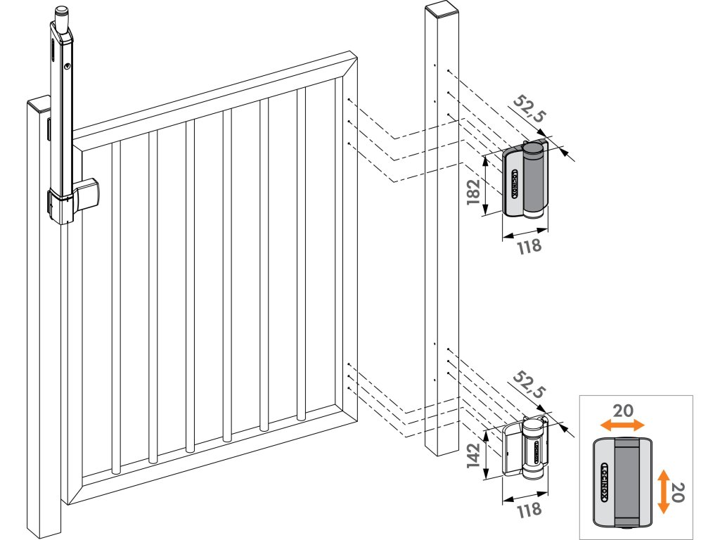 LOCINOX® CARACAL samozatvárateľné závesy pre brány do 60 kg/1.1m, otvarateľný do 180°Estetický samozatvárač pre brány s nastaviteľnou rýchlosťou zatvárania. Púzdro z vystuženého skleného vlákna PA chráni vysokokvalitné vnútorné komponenty, čím zaručuje dokonalú funkčnosť za každého počasia. Možnosť 20 mm vertikálneho a horizontálneho nastavenia umožňuje jednoduchú a flexibilnú inštaláciu. Pevné uchytenie pomocou samovrtných skrutiek - bez potreby zvárania. Vhodné pre inštaláciu na štvorcové aj okrúhle rámy. Ideálne riešenie pre bazény, ihriská, parky a záhradné brány.