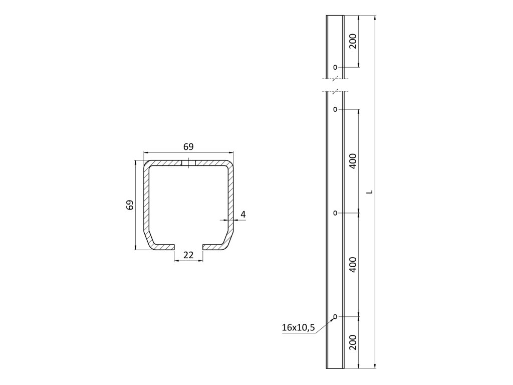 Samonos do 300 kg/4,5 m, profil s otvormi 69 x 69 x 4 mm, Zn