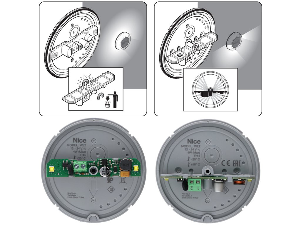 Zapojený na výstup napájania 12/24 Vac/Vdc, Wallyght môže zostať trvale rozsvietený a tiež, po aktivácii zabudovaného súmračného senzora, sa môže rozsvietiť za súmraku a zhasnúť pri východe slnka.