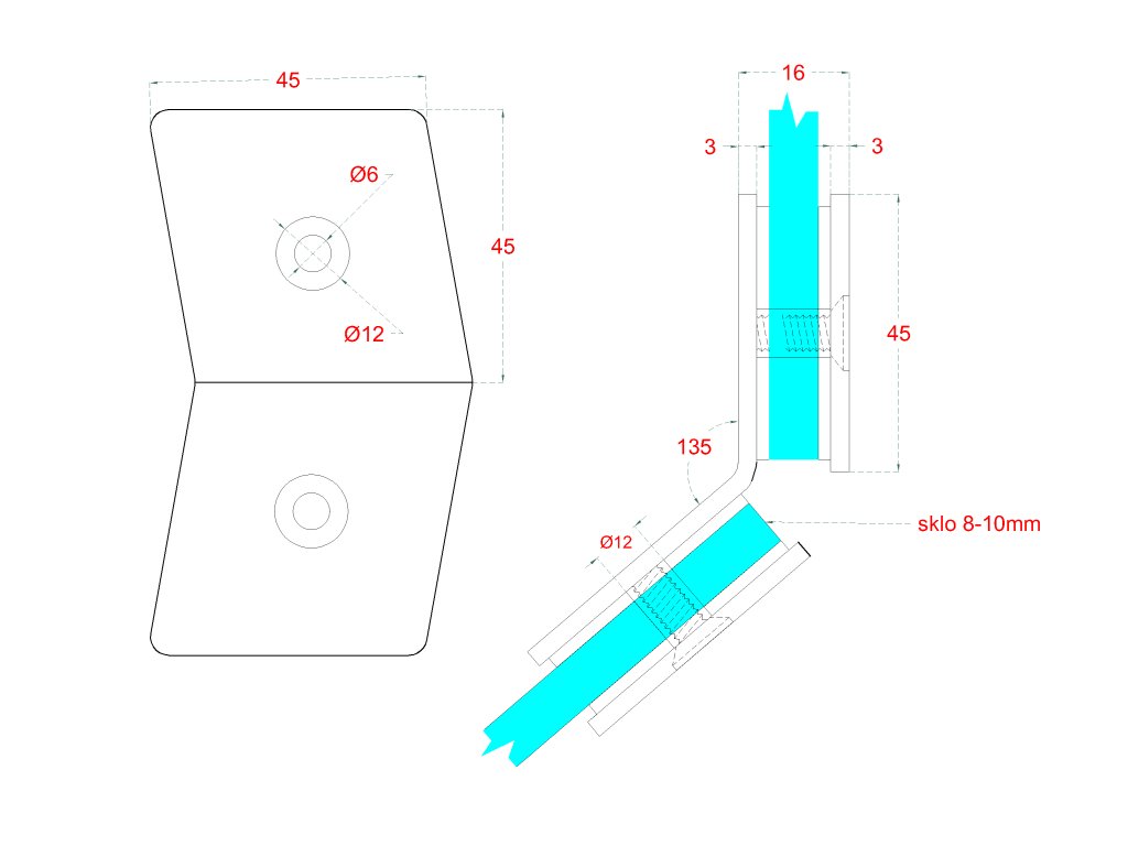 svorka skla na sklenený dverový systém, medzi sklo a sklo 135°, 45x45x16mm, hrúbka skla 8-10mm, brúsená nerez K320/AISI304Dodatočné parametre