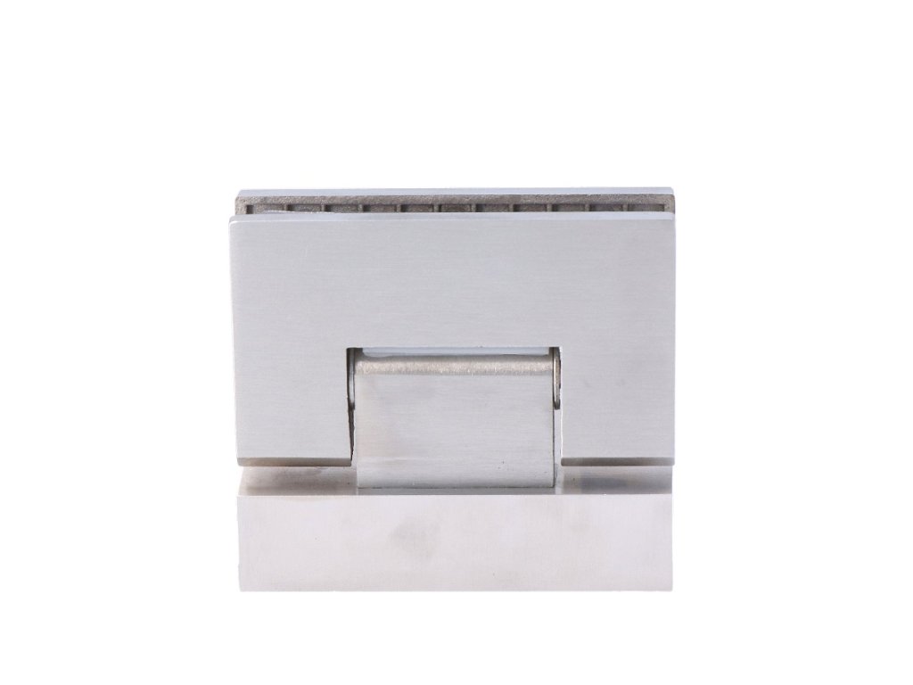 záves na sklenený dverový systém, medzi sklo a sklo 90°, 90x80mm, hrúbka skla 8-10mm, brúsená nerez K320/AISI304, samozatváranie +-15° a samozastavenie +-90°-0°