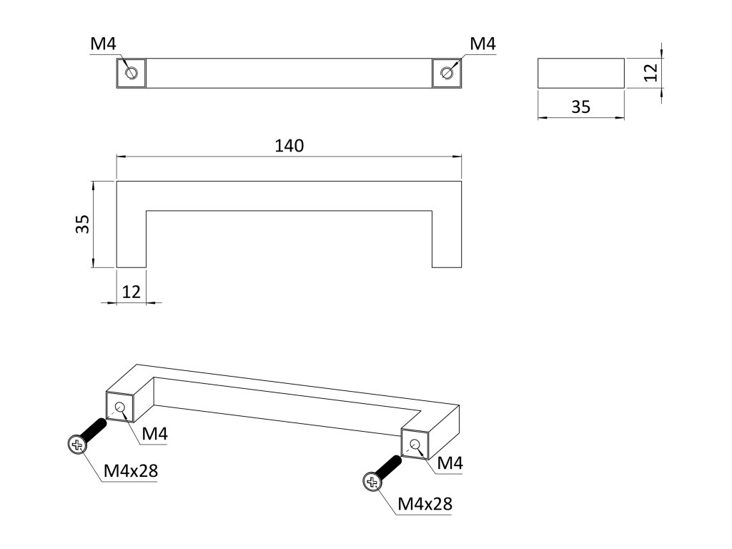 Nerezová úchytka (madlo) pre rozteč 128mm (140x128mm madlo 12x12mm, výška 32mm), dutá, farba: čierna, nerez K320 /AISI304