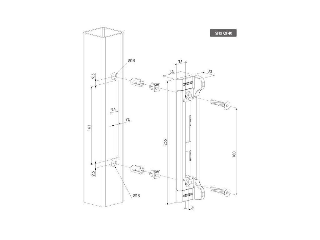 SKKompletná sada na uzamykanie krídlových brán. Sada je univerzálna pre ľavé aj pravé krídlo a je určená pre použitie do profilu 40x40 mm. Sada obsahuje nerezový zadlabávací zámok, cylindrickú EURO vložku s tromi kľúčmi, hliníkové kľučky a štítky, dorazovú lištu. Zámok je nastaviteľný 10 mm.