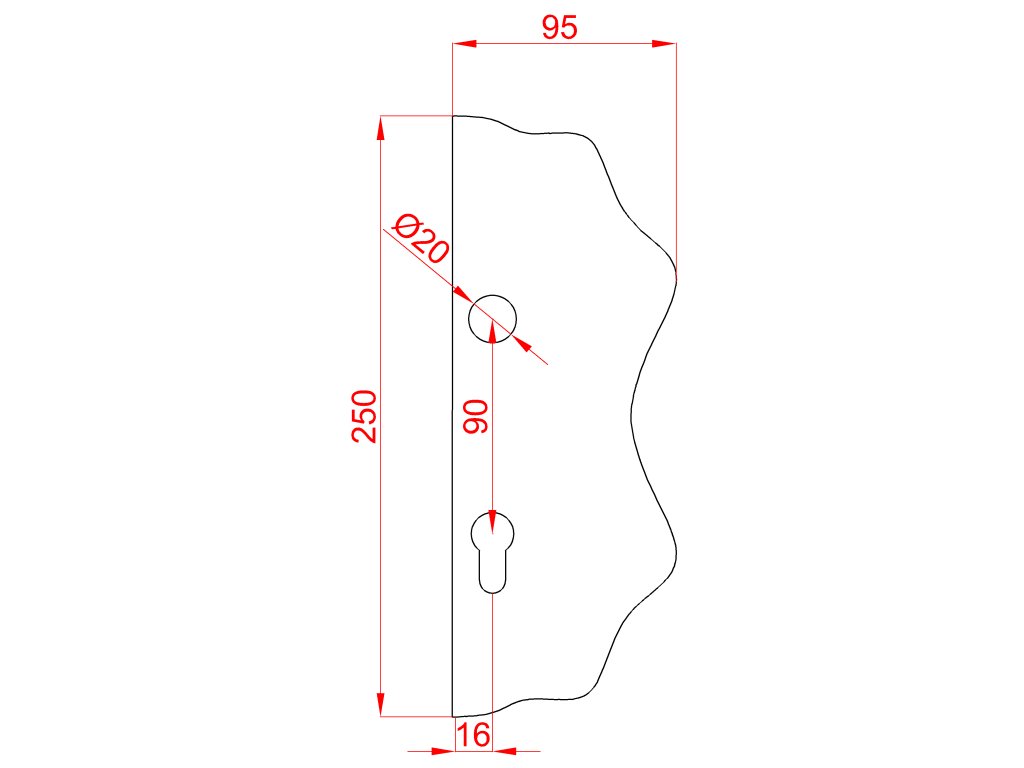 Štít 250x95x3mm s otvormi, rozteč 90mm, otvor pre kľučku ø 20mm, ozdobný, pravý, pre zámok ZM90/80