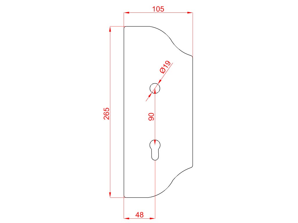 Štít 265x105x3mm s otvormi, rozteč 90mm, otvor pre kľučku ø 19mm, zdobený, pravý, pre zámok ZM90/80