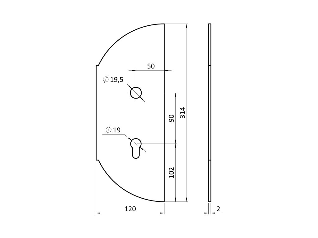 Štít 314x120x2mm s otvormi, rozteč 90mm, otvor pre kľučku ø 19.5mm, zdobený, ľavý, pre zámok