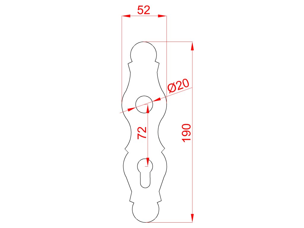 štít s otvormi 210x52x3mm, rozteč 72mm, otvor na kľučku ø20 mm