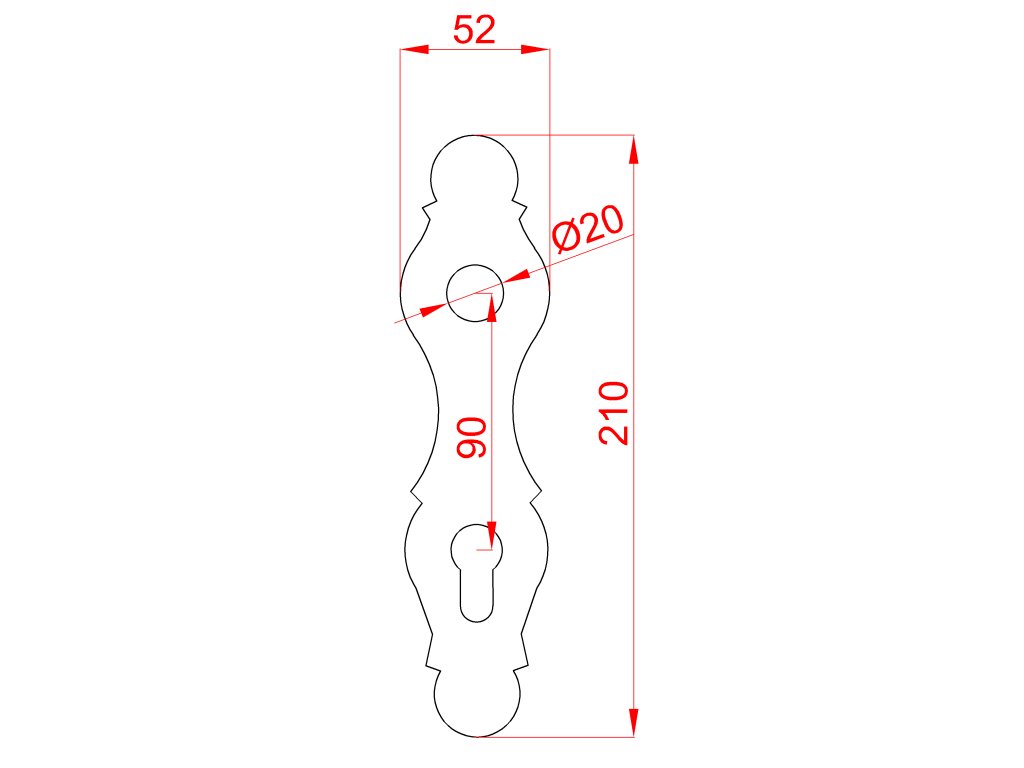štít s otvormi 210x52x3mm, rozteč 90mm, otvor na kľučku ø20 mm