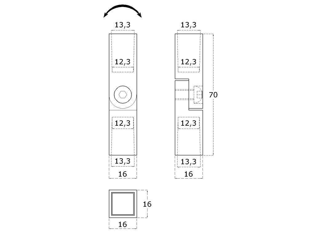 Do vypredania zásob: Zužujúci spoj nastaviteľný, štvorcový (na tyč 12x12mm /L: 70mm), brúsená nerez K320 /AISI304