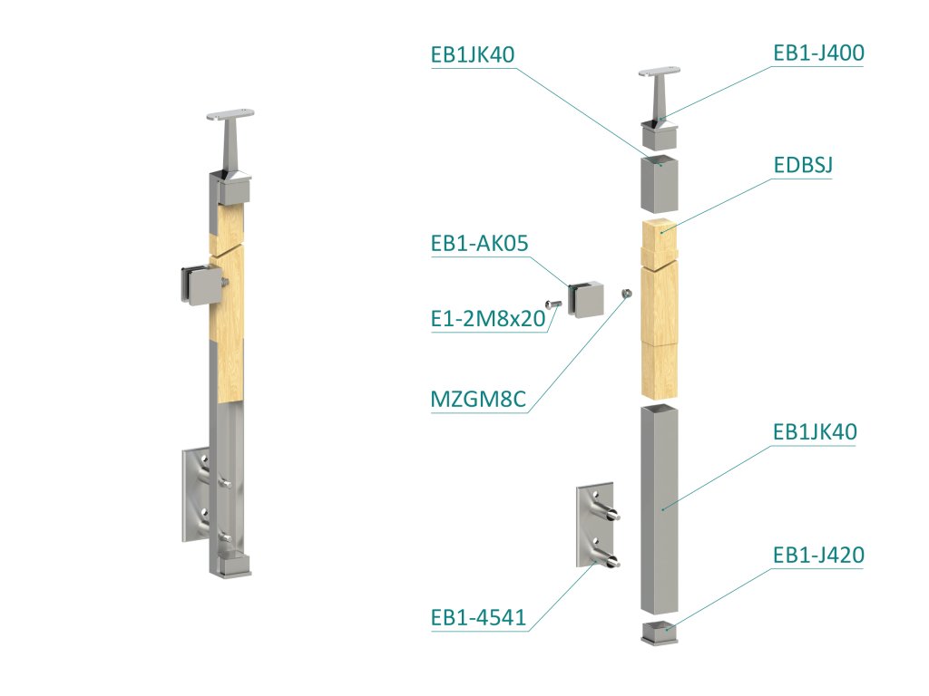 drevený stĺp, bočné kotvenie, výplň: sklo, ľavý, vrch pevný (40x40mm), materiál: buk, brúsený povrch s náterom BORI (bezfarebný)