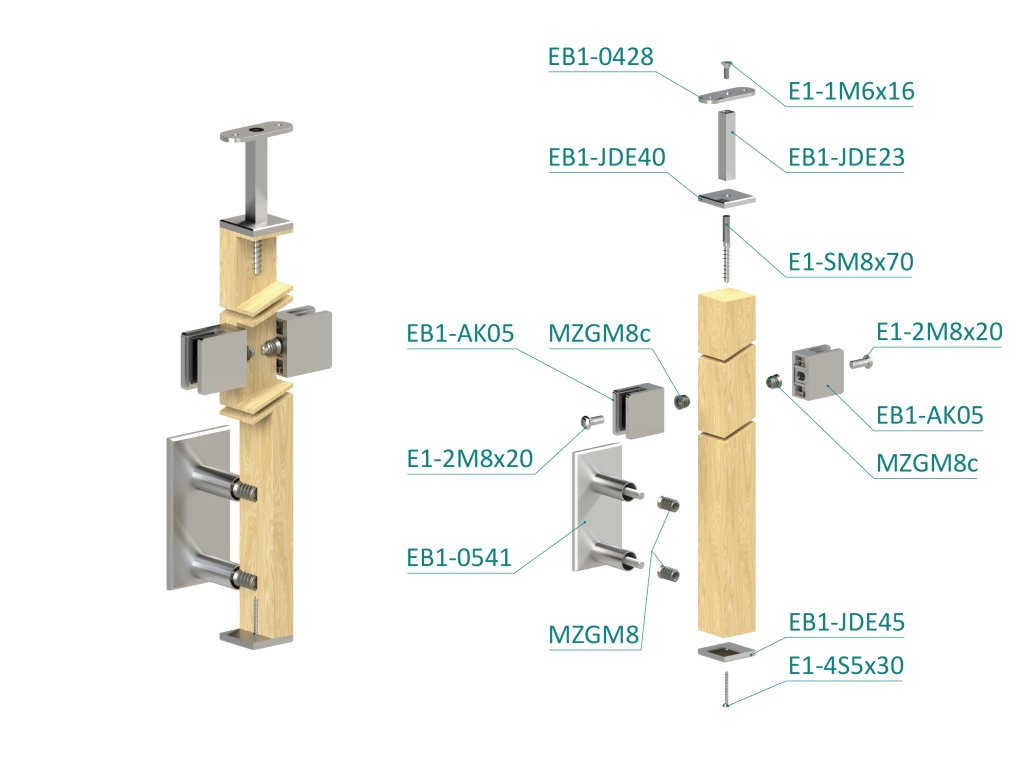 drevený stĺp, bočné kotvenie, výplň: sklo, priechodný, vrch pevný (40x40mm), materiál: buk, brúsený povrch bez náteruDodatočné parametre