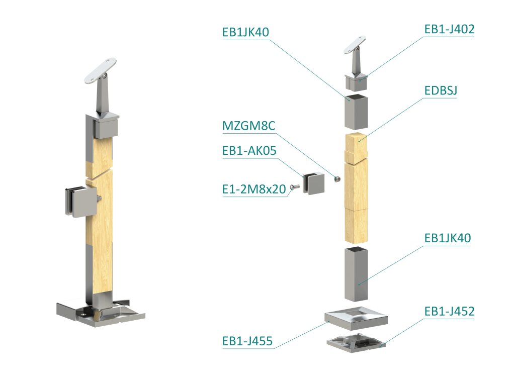 drevený stĺp, vrchné kotvenie, výplň: sklo, ľavý, vrch nastaviteľný (40x40mm), materiál: buk, brúsený povrch bez náteru