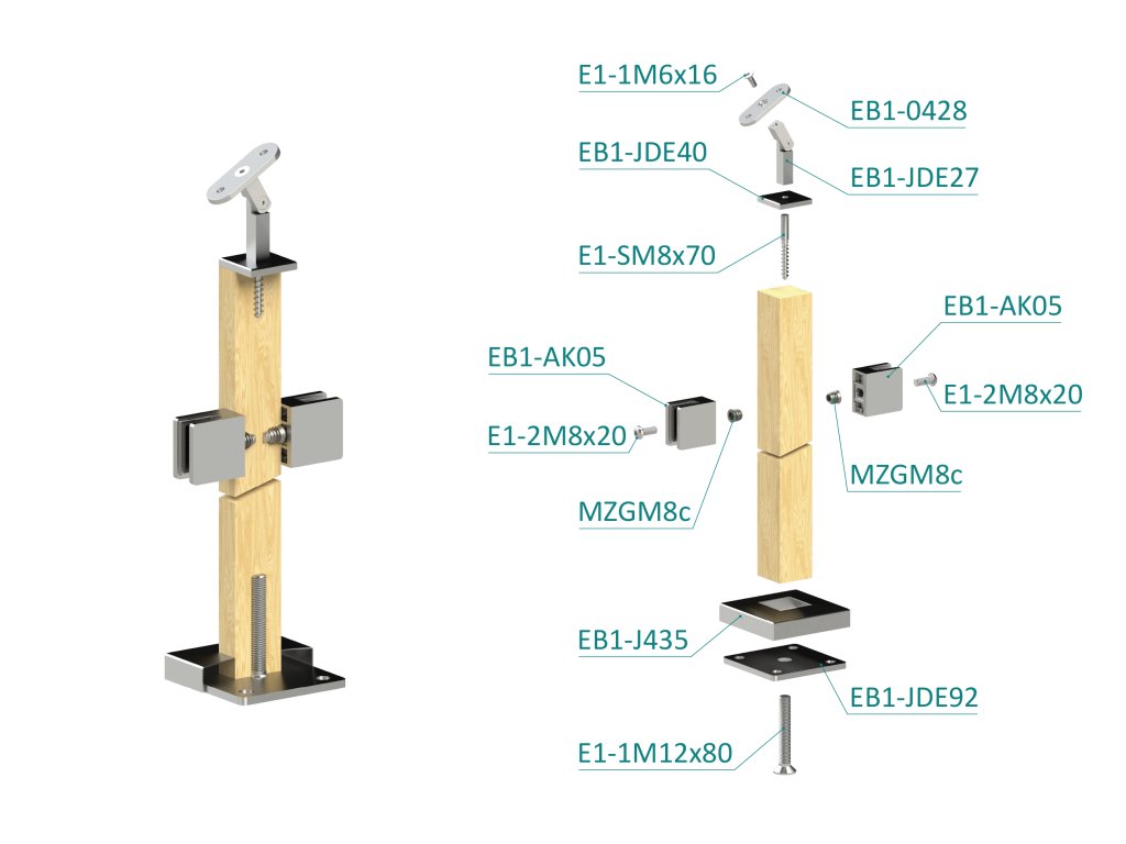 drevený stĺp, vrchné kotvenie, výplň: sklo, priechodný, vrch nastavit. (40x40mm), materiál: buk, brúsený povrch s náterom BORI (bezfarebný)Dodatočné parametre