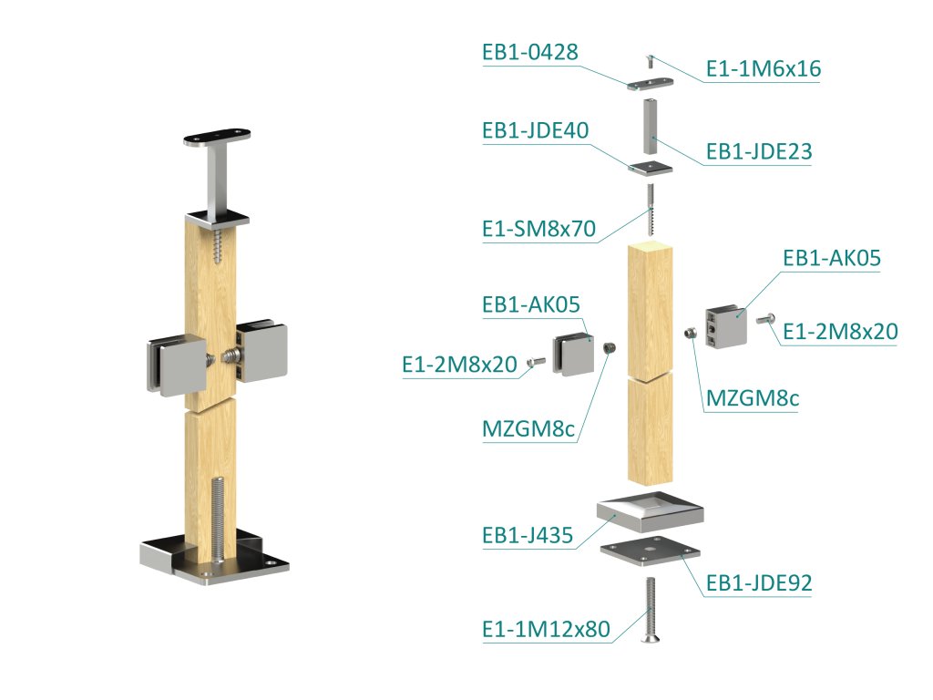 drevený stĺp, vrchné kotvenie, výplň: sklo, priechodný, vrch pevný (40x40mm), materiál: buk, brúsený povrch s náterom BORI (bezfarebný)Dodatočné parametre